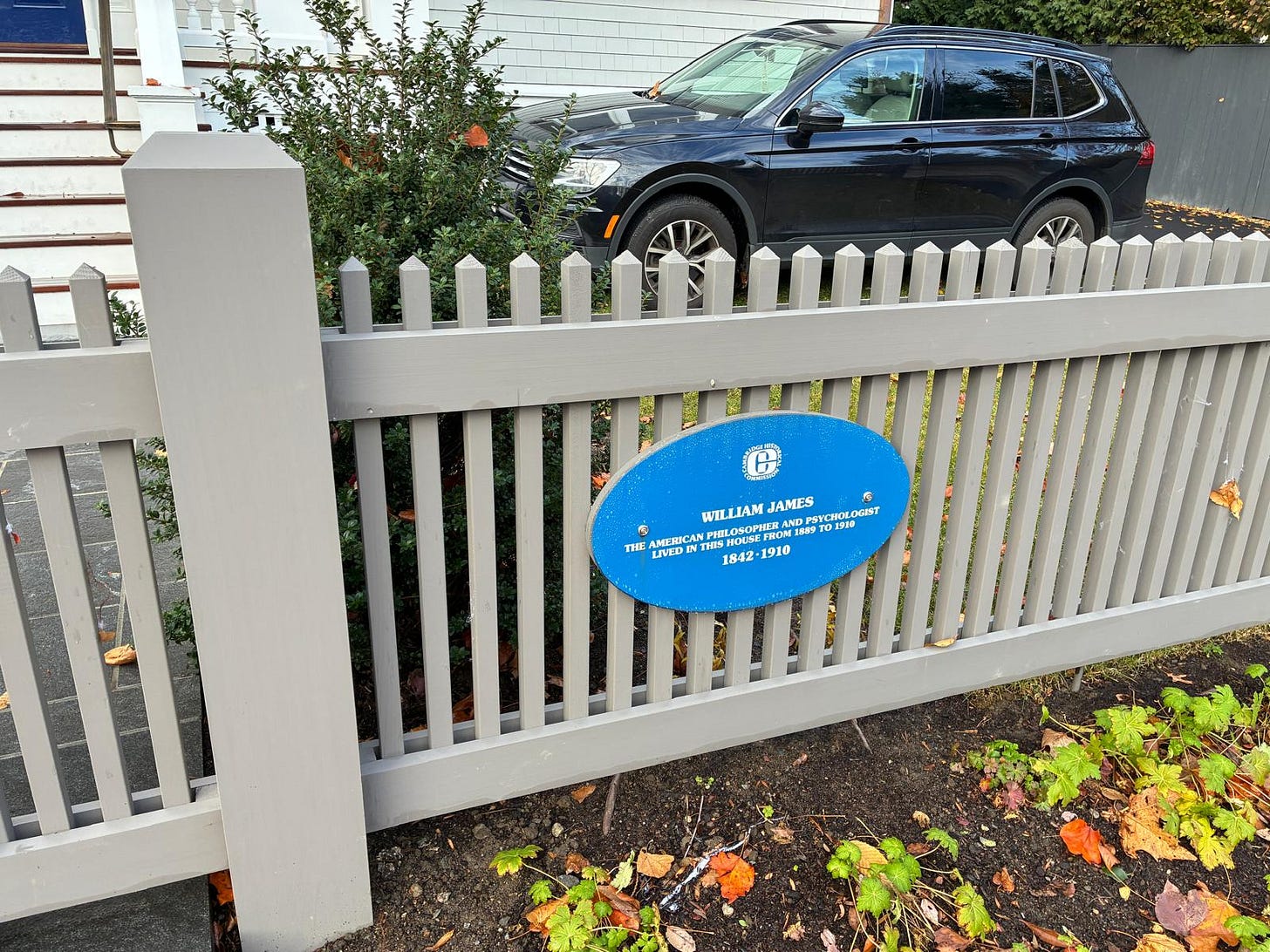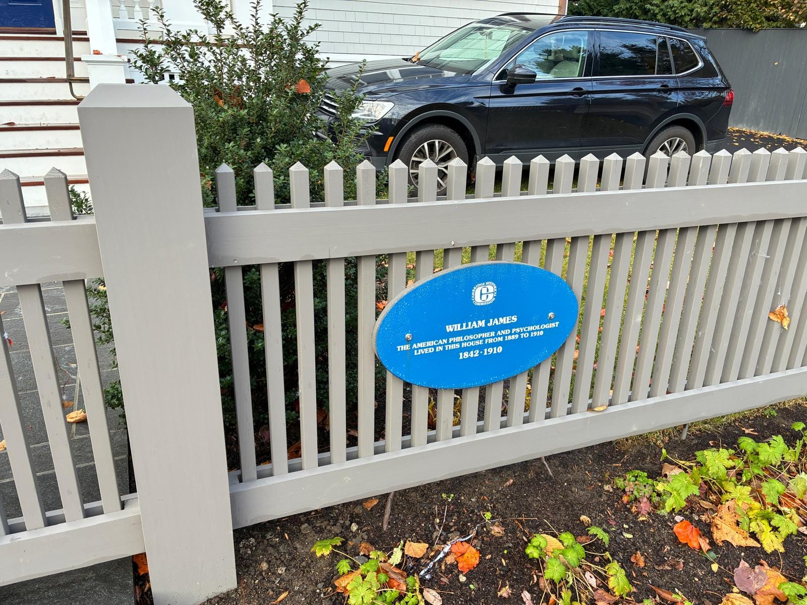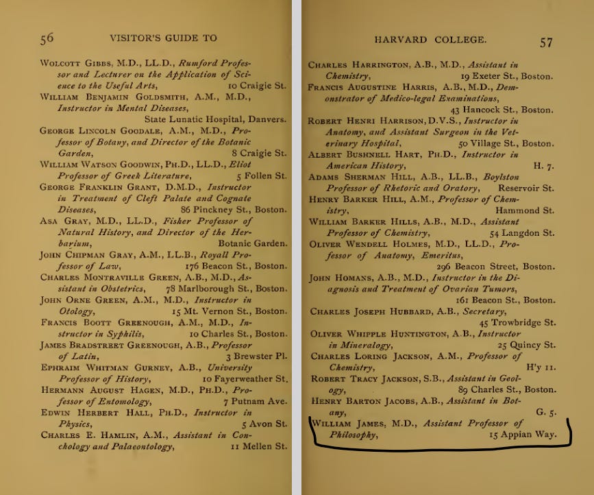 It turns out that a traveler visiting Cambridge in 1885 could buy a Visitor’s Guide to Harvard University and learn not only the location and brief history of Harvard Hall, Massachusetts Hall, and the statue of John Harvard, but also the home address of each and every Harvard professor. And according to this guide, William James, M.D., Assistant Professor of Philosophy, lived at 15 Appian Way, which is near Cambridge Common, half a mile southwest of Divinity Hall.