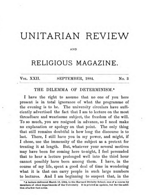 The Dilemma of Determinism was first published in September 1884. We learn from a footnote on the first page that it is the text of a lecture given by James the previous March “to the Harvard Divinity School.” A book chapter by John Martin Fischer, a philosopher writing on free will and responsibility, notes that the lecture was given “in Lowell Lecture Hall.” (John Martin Fischer, Indeterminism and Control: An Approach to the Problem of Luck, in Law and Neuroscience, vol. 13, p. 41).
