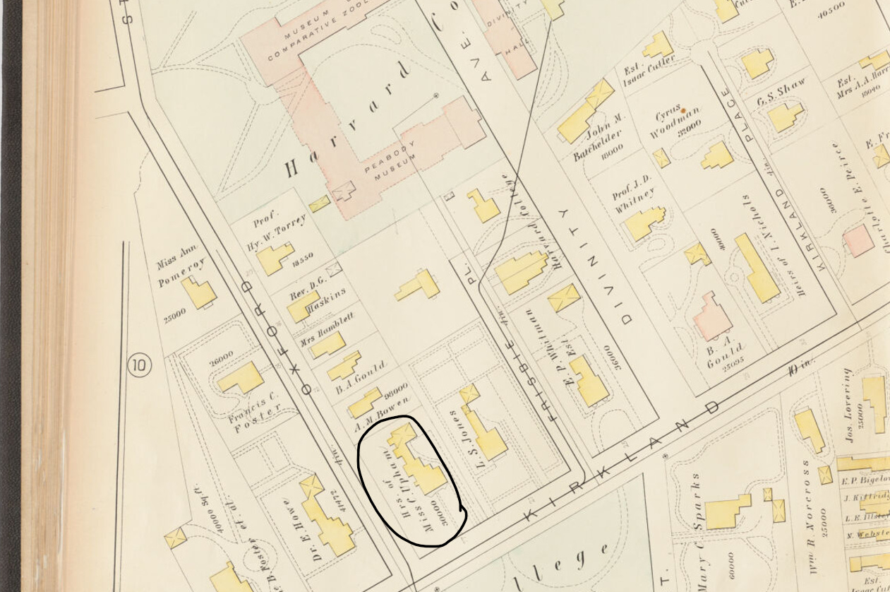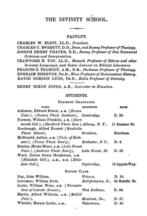 Another option is the house of one of the Divinity School’s faculty members. Back then, Harvard was a small institution, with fewer than 2,000 students and a few dozen professors. In 1884, according to the official catalog, the Divinity School had twenty enrolled students and six recent graduates who were still around. It had only seven faculty members (the law school had five).