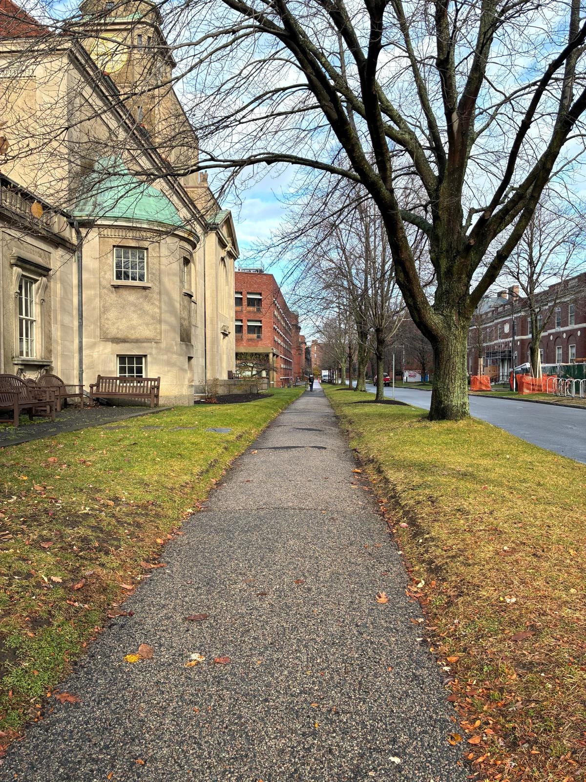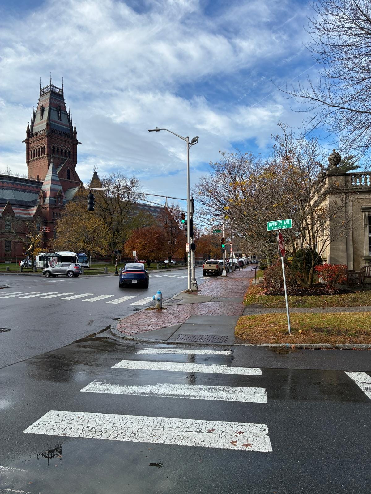 Oxford Street and Divinity Avenue run parallel to each other and are connected to the south by Kirkland Street. You can walk down Kirkland, with Oxford behind you, towards Divinity Avenue, and this is roughly what you see today, in November 2025: