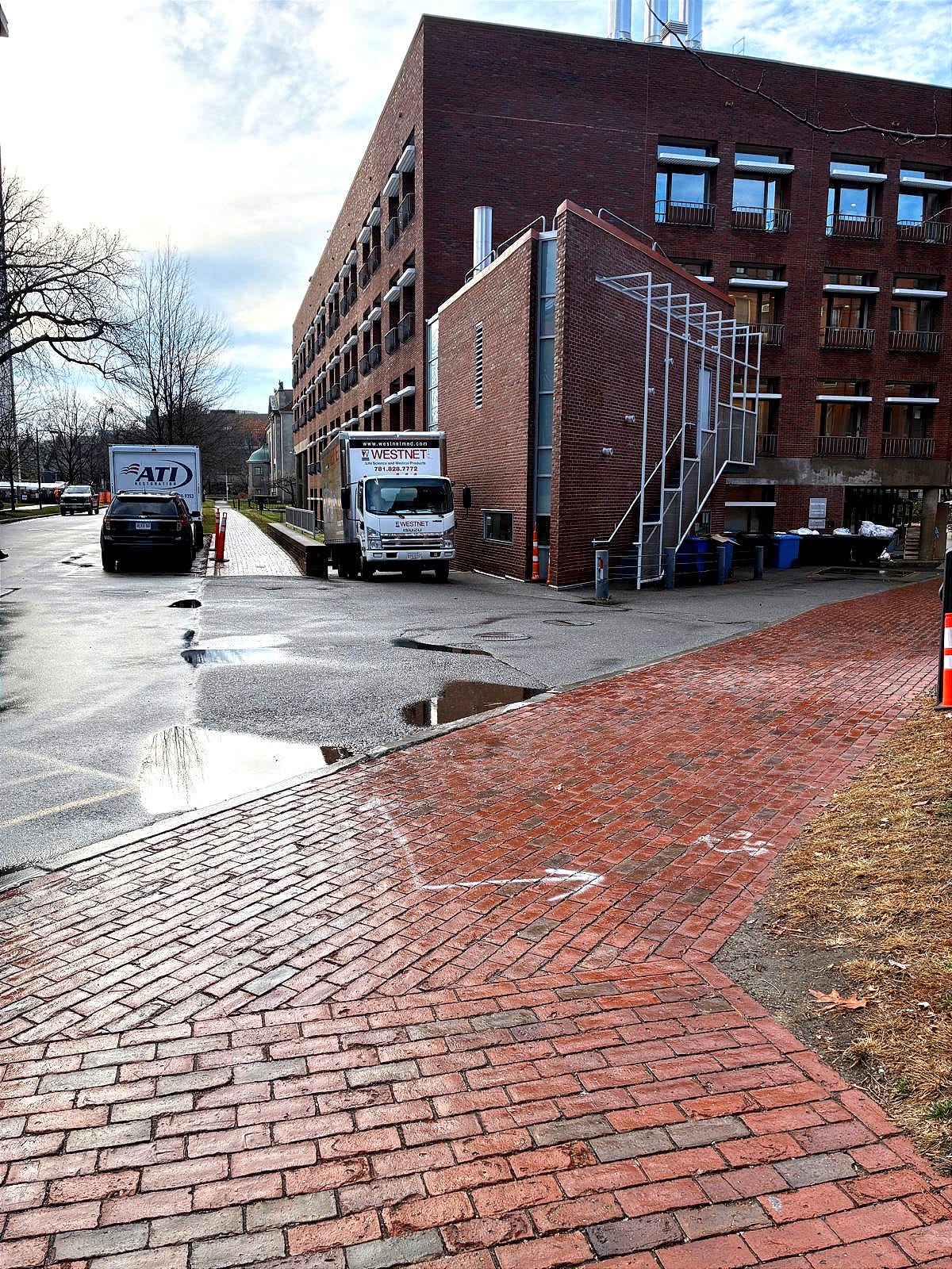 If you stand at the intersection of Divinity Avenue and Kirkland Street, looking toward Oxford, this is what you see, with Memorial Hall and its High Victorian Gothic tower on the left. Henry James, William’s older brother, writes in The Bostonians that Memorial Hall, “consecrated to the sons of the university who fell in the long Civil War… seems a kind of temple to youth, manhood, generosity.” Given the paucity of good architecture nearby, it is a pleasant sight.