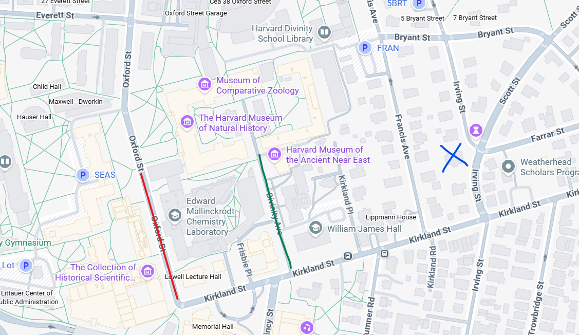 A map of the neighborhood in November 2025, from Google Maps. Oxford Street is marked in red; Divinity Avenue in green; William James’s house with a blue X.
